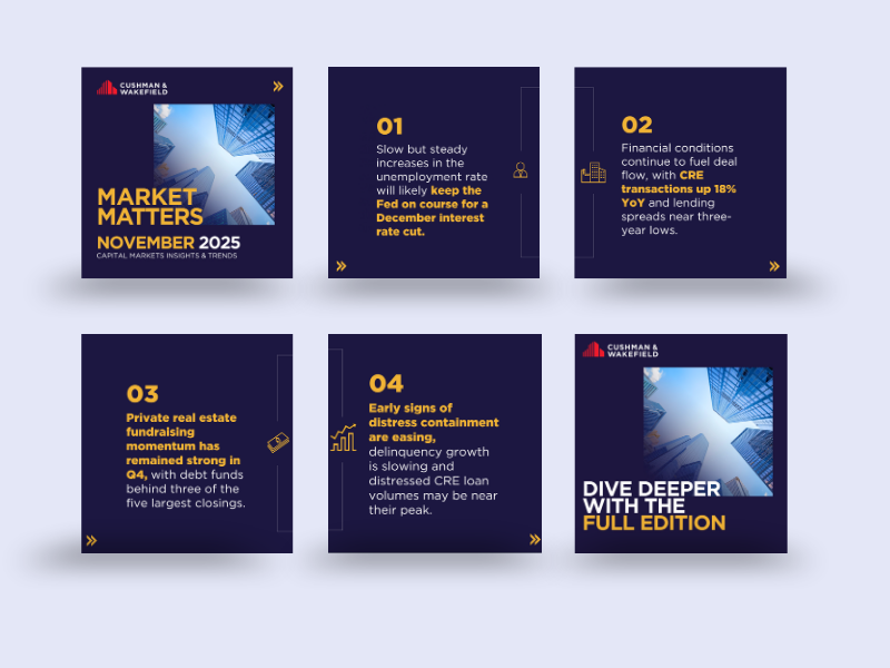 To promote the piece on LinkedIn, I partnered with the Design team again to create a complimentary carousel that highlighted key insights from the report and reimagined Cushman & Wakefield’s visual branding. The goal was to distill the most compelling takeaways into a format that was visually engaging, easy to digest, and optimized for investor engagement.