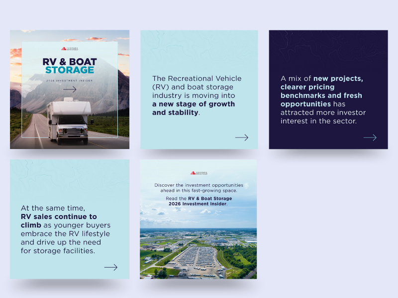 Thought Leadership LinkedIn Promotion. Creating collateral for events and market reports was core to my weekly and quarterly marketing responsibilities, but promoting thought leadership from our practice group leaders was also an integral part of my role. One of the most significant pieces I supported during my time at Cushman & Wakefield was the 2026 RV & Boat Storage Investment Insider, authored by the Executive Director of our Recreational Vehicle Storage practice group.