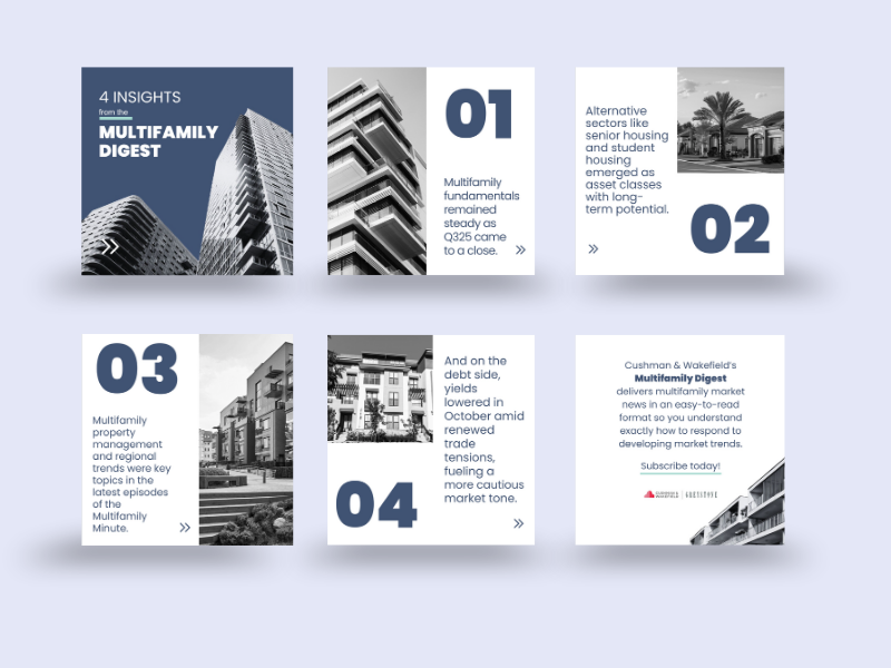 Capital Markets Social Carousels. To reinforce Cushman & Wakefield’s position as an industry leader, we focused on showcasing our expertise across all facets of capital markets. One key initiative was elevating our multifamily research. I created a carousel template to highlight insights from our quarterly Multifamily Digest, ensuring the design aligned with the brand guidelines of our JV partner, Greystone, while maintaining Cushman & Wakefield’s authoritative tone. Each slide distilled a core takeaway from that quarter’s report, giving investors a clear, digestible snapshot of the multifamily market.